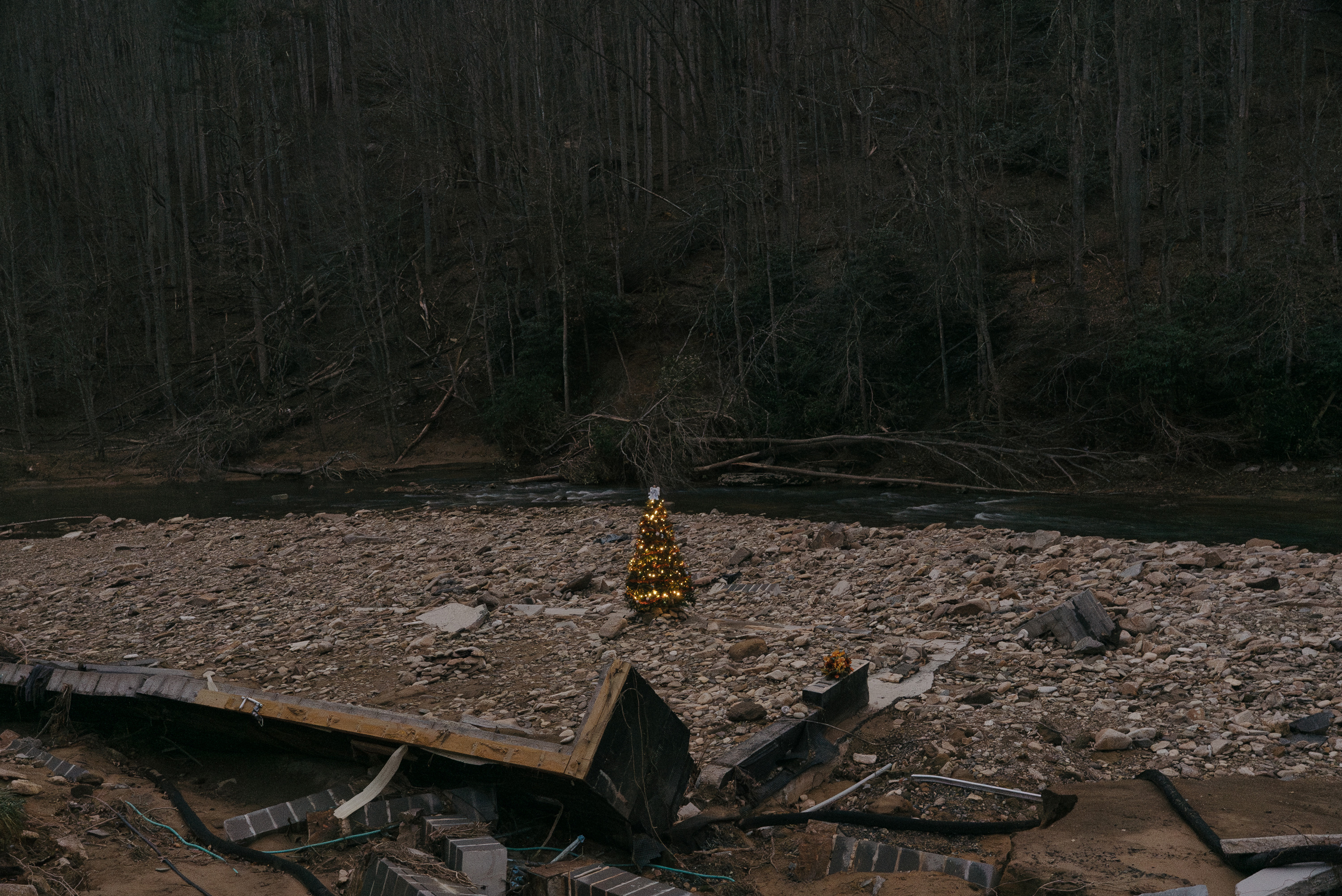A Christmas tree stands in the rubble where Kim and Rod Ashby’s home once stood along the Elk River near Elk Park. The Ashbys were separated in Hurricane Helene’s floodwaters the day of the storm, with Rod escaping to the bank a few miles downriver. Kim has yet to be found. A celebration of life was held for her in December 2024. Photo by Jesse Barber