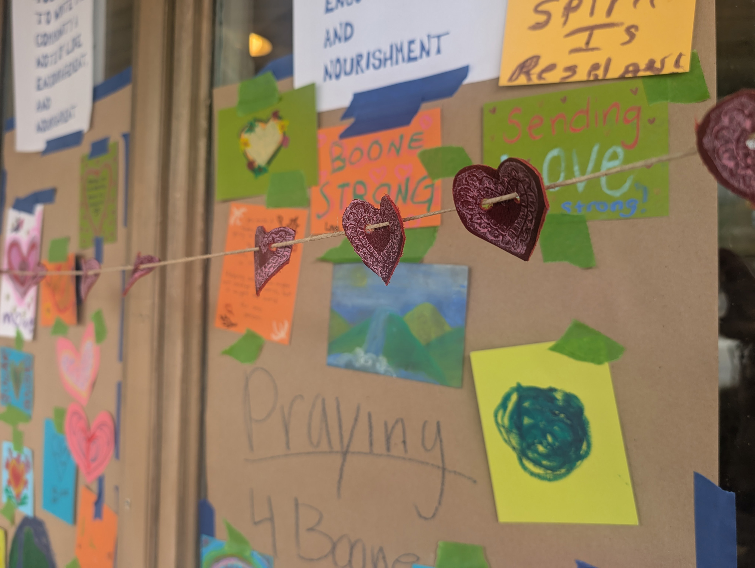 The Boone community created art through the Sidewalk Expressive Arts Ministry project in downtown, in response to Hurricane Helene. The work is documented in App State’s Art Relief Map, an evolving online record of therapeutic, art-based offerings that have emerged in response to natural disasters. Photo courtesy of Andi Gelsthorpe