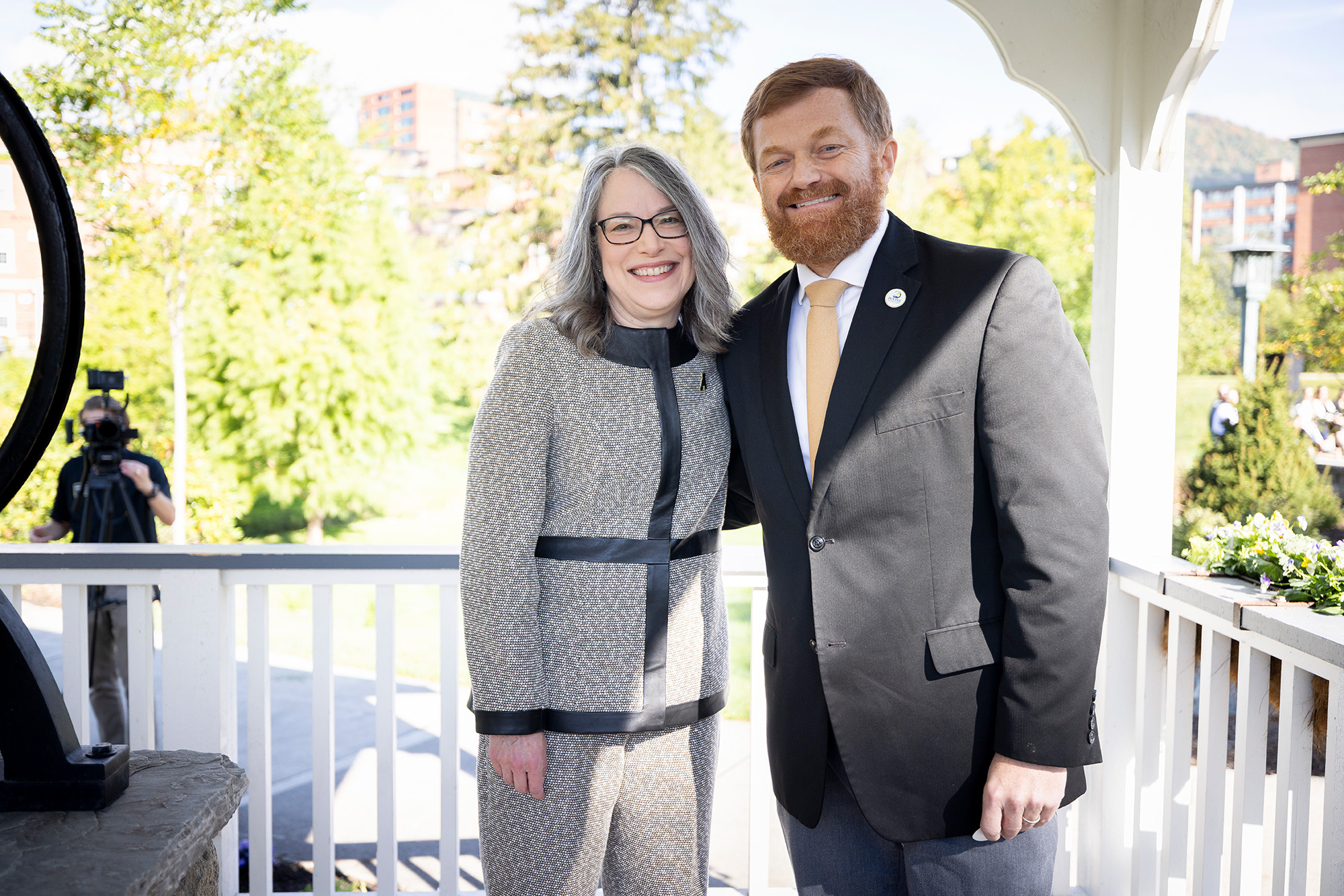 App State Chancellor Heather Norris, left, with App State alumnus David Jackson ’00, president and CEO of the Boone Area Chamber of Commerce, at the university’s 2025 Founders Day ceremony, held Oct. 2 at Founders Plaza on App State’s Boone campus. Jackson is one of seven Class of 2025 members inducted into App State’s Bell Ringers Society. Photo by Kyla Willoughby