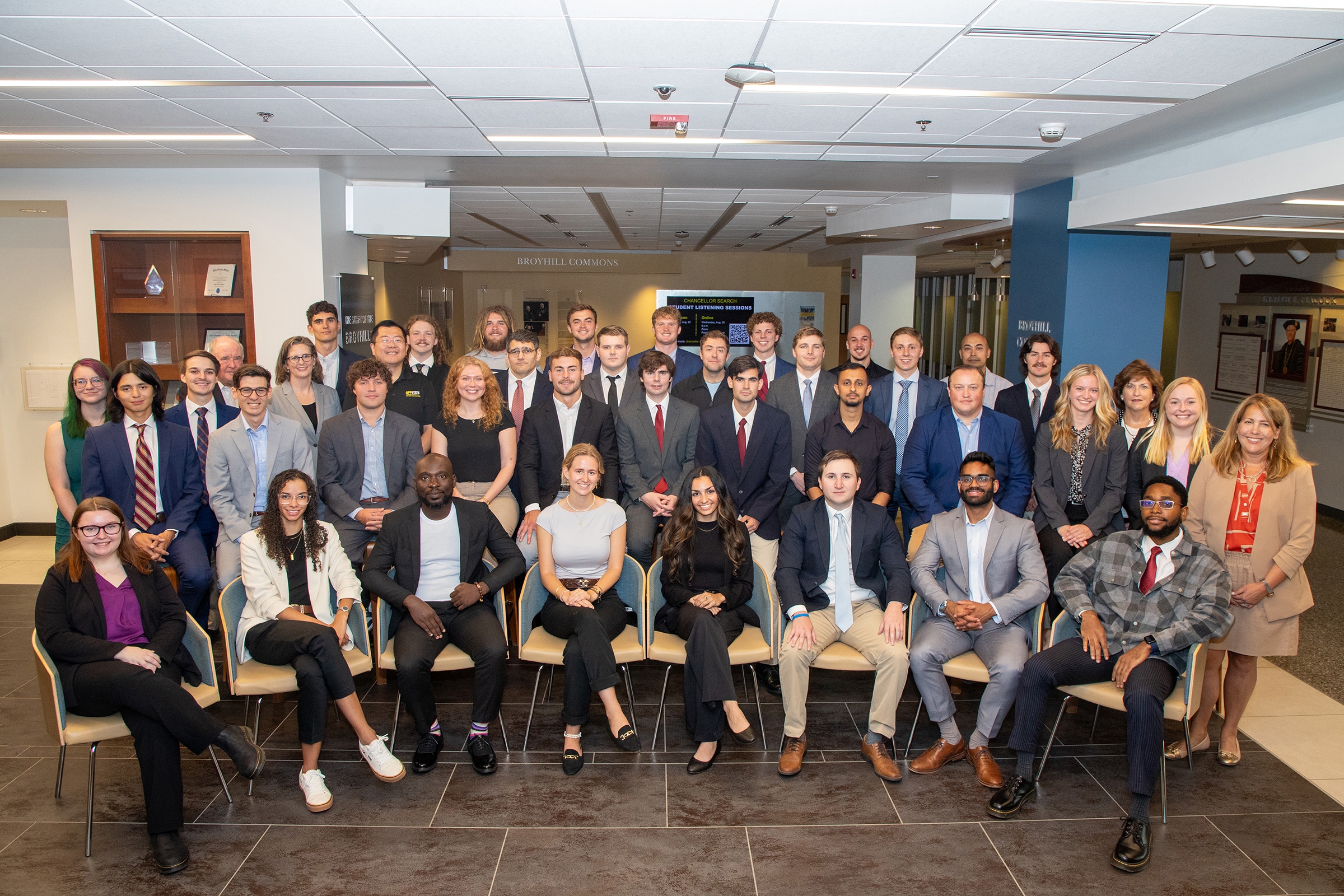 The fall 2024 student cohorts of App State’s Master of Business Administration (MBA) and Master of Science in applied data analytics (MSADA) programs, along with MBA and MSADA program faculty, are pictured in Peacock Hall, which houses the university’s nationally and internationally recognized Walker College of Business. Photo by Sabrina Cheves