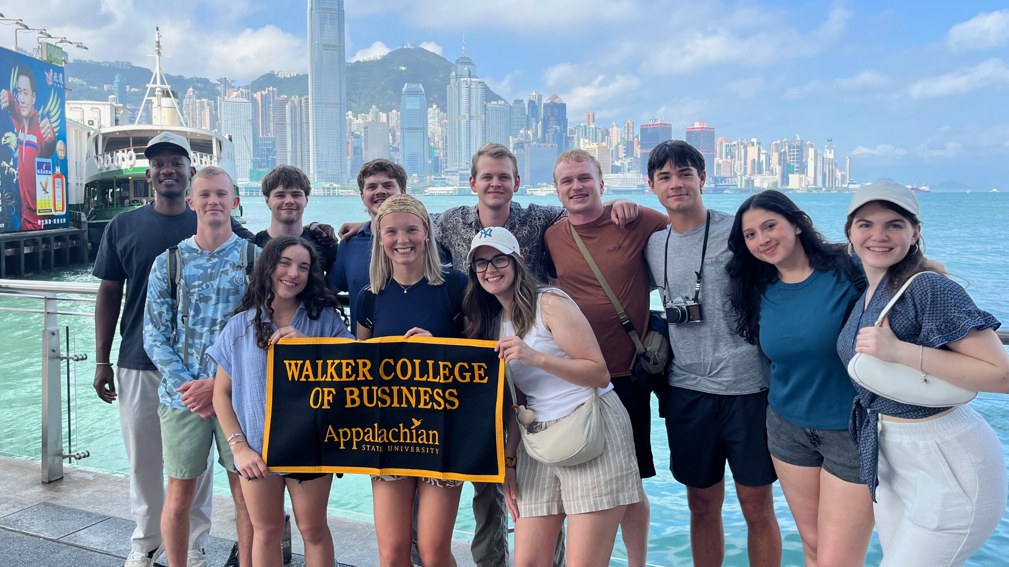 Pictured earlier this year, Holland Fellows from Appalachian State University hold a Walker College of Business banner along the Tsim Sha Tsui Promenade in front of the Victoria Harbour waterfront in Hong Kong. The International Finance Centre and the Hong Kong Island skyline are visible in the background. Through App State’s William R. Holland International Business Fellowship, Holland Fellows engage in an immersive global experience, exploring business design and internationalization strategies with organizations and leaders shaping markets across Asia and the world. Photo by Jesse Pipes