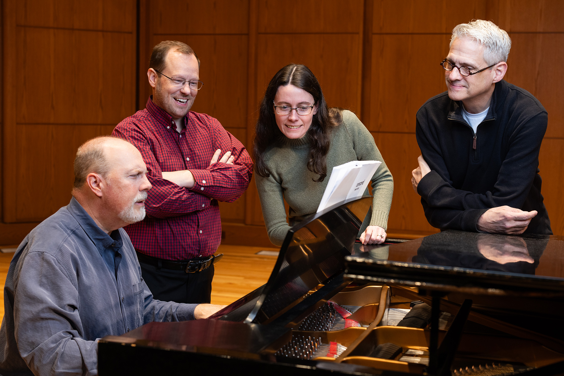 The creative team behind the collaborative performance of the musical comedy “Once Upon a Mattress” at App State include, from left to right, music directors Dr. Joby Bell and Dr. Tyler Young; orchestra conductor Dr. Alexandra Dee; and director and choreographer Kevin Warner. Photo by Chase Reynolds