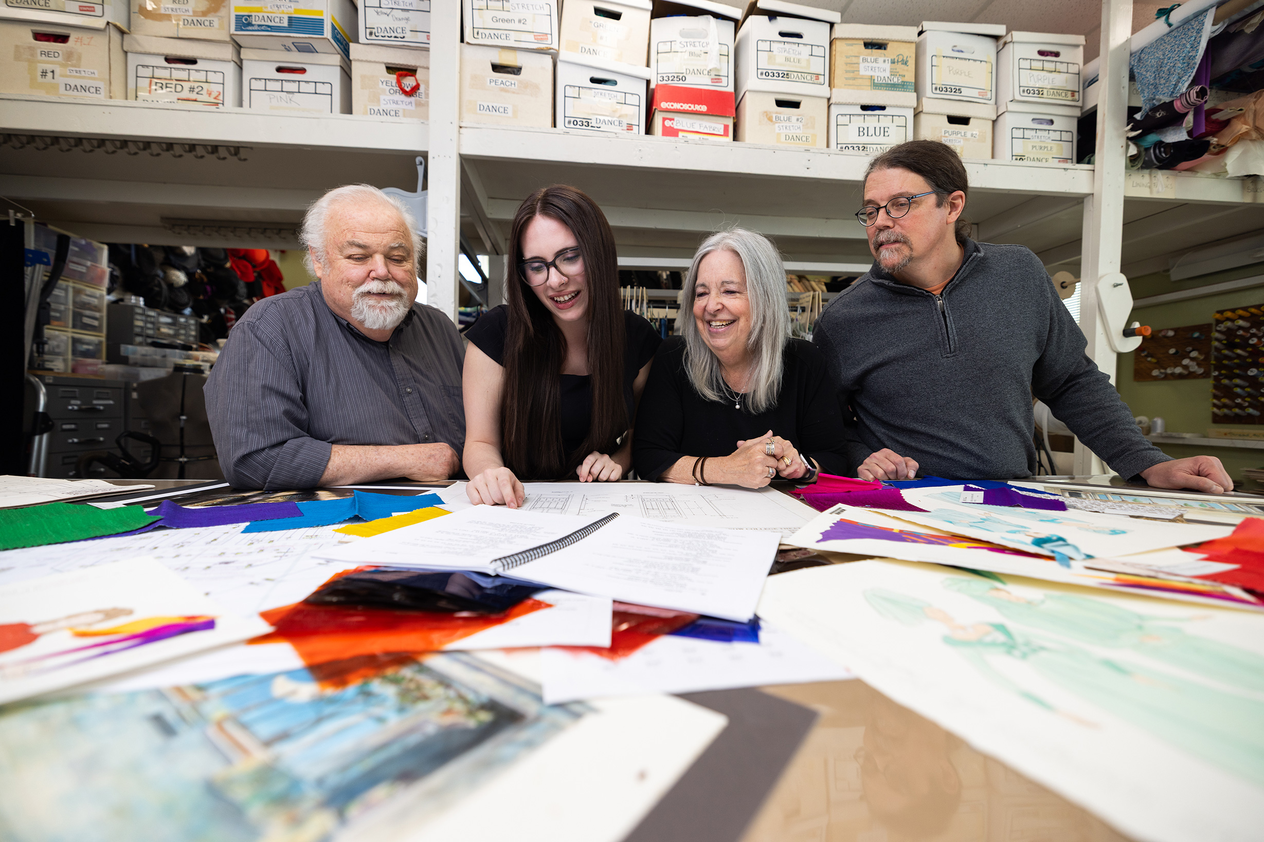 The App State design and production team bringing “Once Upon A Mattress” to life includes, from left to right, set designer Mike Helms; stage manager and senior theatre arts major Echo McArthur, of Greensboro; costume designer Martha Marking; and lighting designer John Marty. Photo by Chase Reynolds