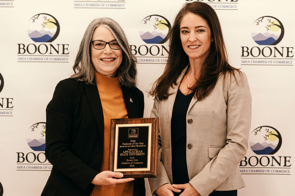 App State Chancellor Heather Norris, left, accepts the 2025 Large Business of the Year Award on behalf of the university and the App State Community during the 10th annual High Country Economic Kickoff Luncheon, hosted by the Boone Area and Blowing Rock chambers of commerce and the Watauga Economic Development Commission on Jan. 15 at App State’s Boone campus. Norris accepted the award from local business owner and event sponsor Collette Woodruff, PC, right. Photo by Martha McGougan ’22