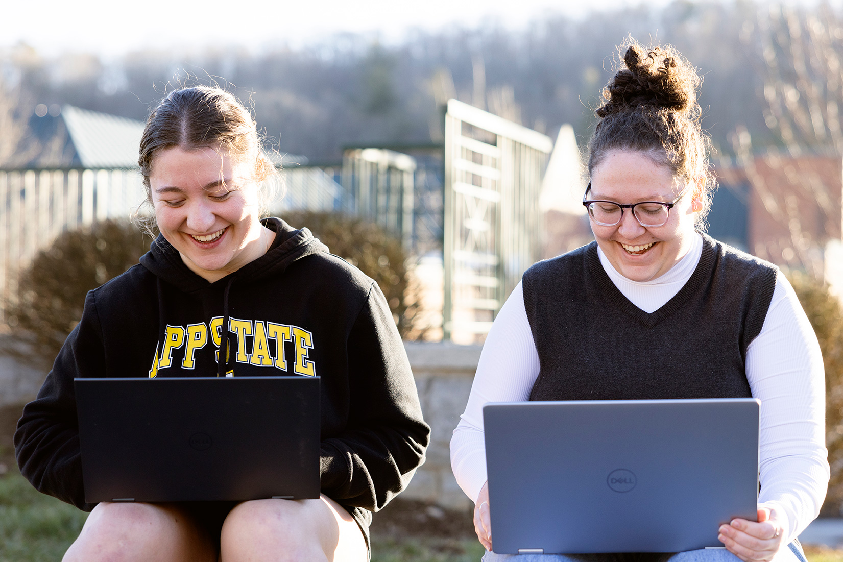 App State’s online bachelor’s programs and graduate programs in business, education and nursing — offered through App State Online — are ranked among the best in the nation by U.S. News & World Report, which recognized the university in its “2026 Best Online Programs” rankings. Pictured, two Mountaineer students smile while working on their laptops. Photo by Kyla Willoughby