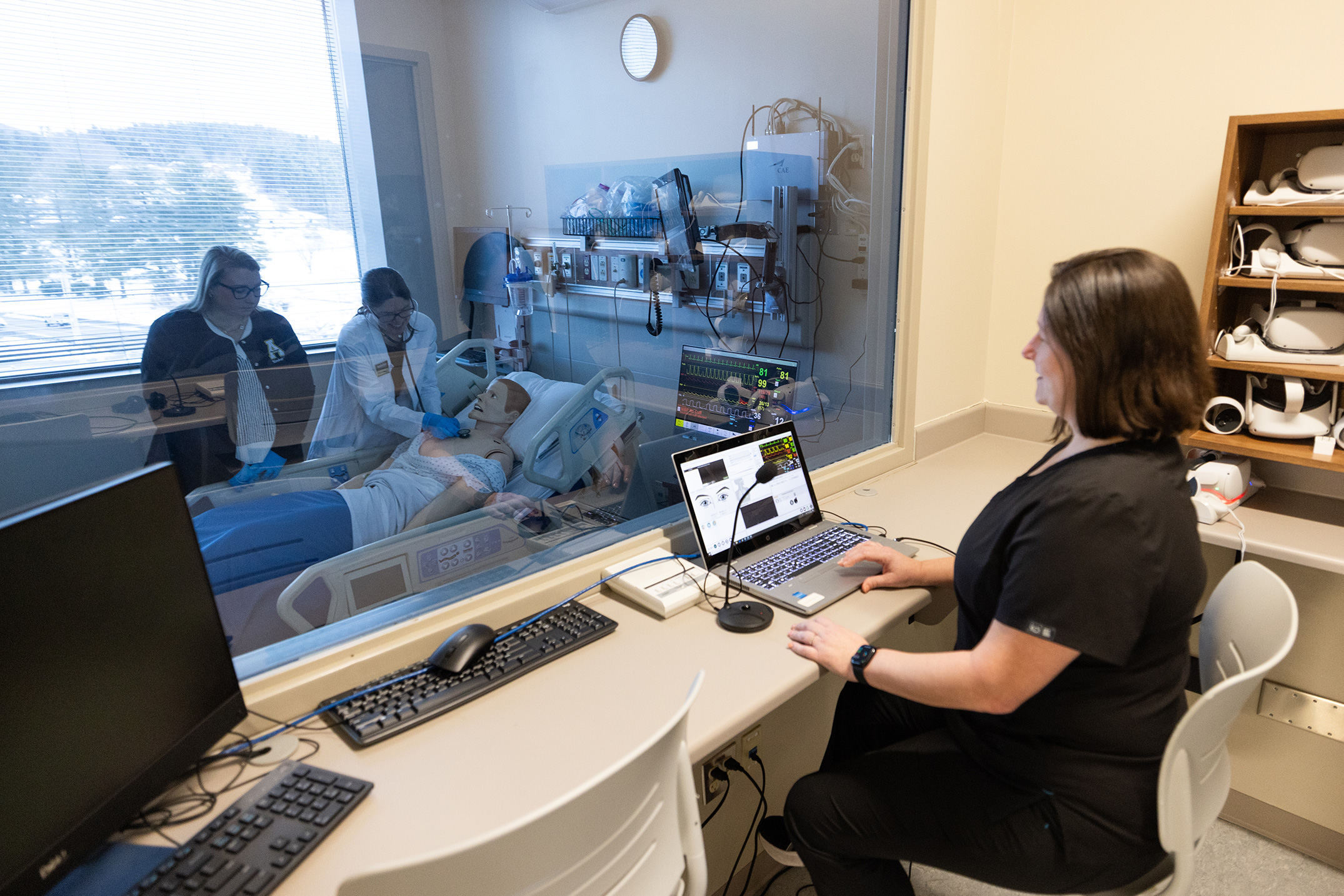 Jennifer White, director of health care simulation and innovation learning in App State’s Department of Nursing, right, views Dr. Melinda Bogardus, assistant professor in the nursing department, center, and App State senior nursing major Kimber Blackburn, of Clayton, left, as they engage in a hands-on exercise with a simulation mannequin in the Beaver College of Health Sciences’ Healthcare Simulation Lab, located in the Levine Hall of Health Sciences. Students in App State’s Doctor of Nursing Practice program, to begin this fall, will spend one week of each semester engaged in intensive skill development at App State’s Hickory campus, utilizing the high-tech nursing simulation laboratory space that is scheduled to open at the campus this fall. Photo by Chase Reynolds