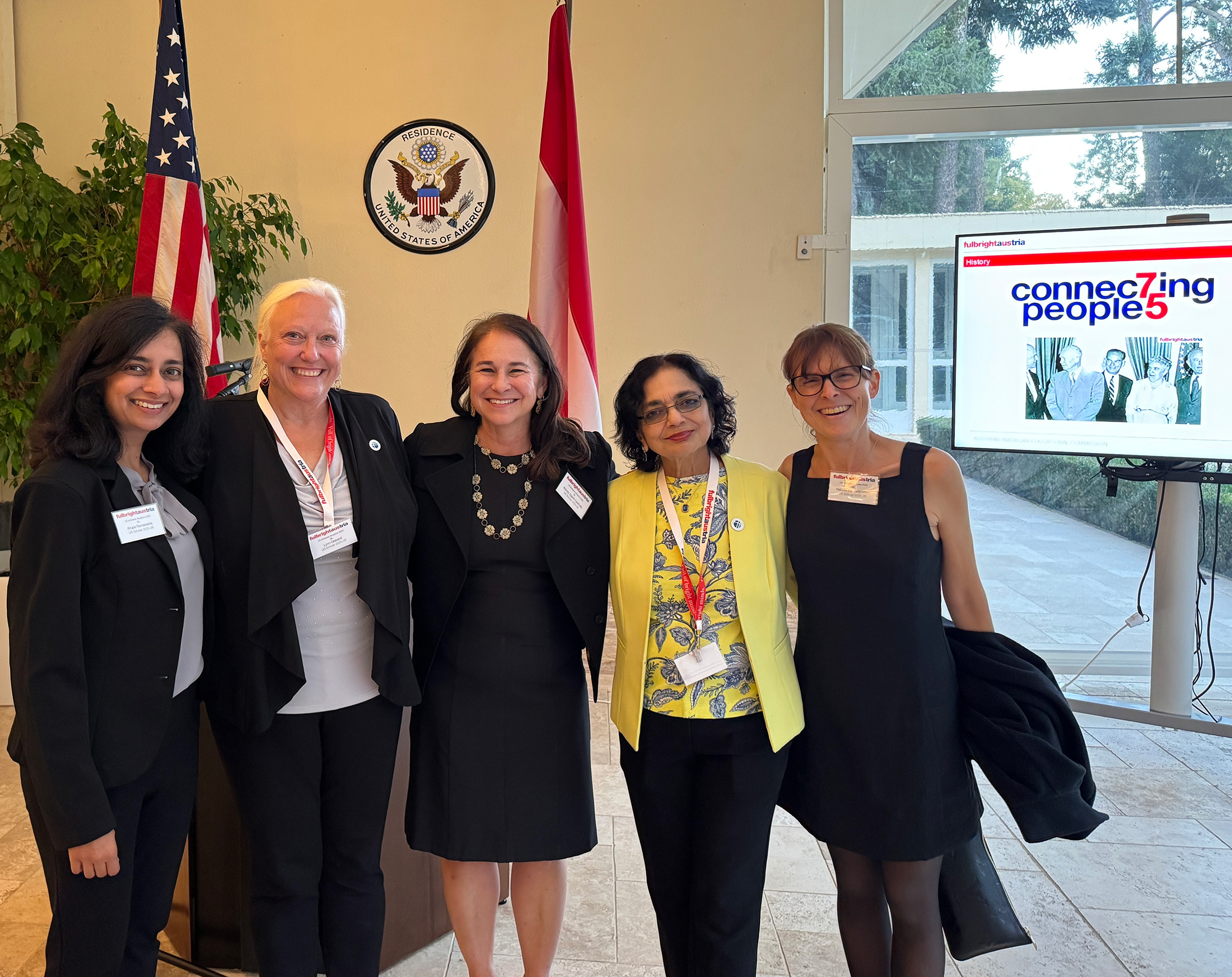 Dr. Lynn Gibbard, professor of communications studies at App State, second from left, is pictured with other 2025–26 Fulbright scholars in Austria. Gibbard received a Fulbright appointment at the University College of Teacher Education Vorarlberg in Austria, to teach seminars on “American Studies in Media and Military Culture: Building Intercultural Understanding.” Photo courtesy of Dr. Lynn Gibbard