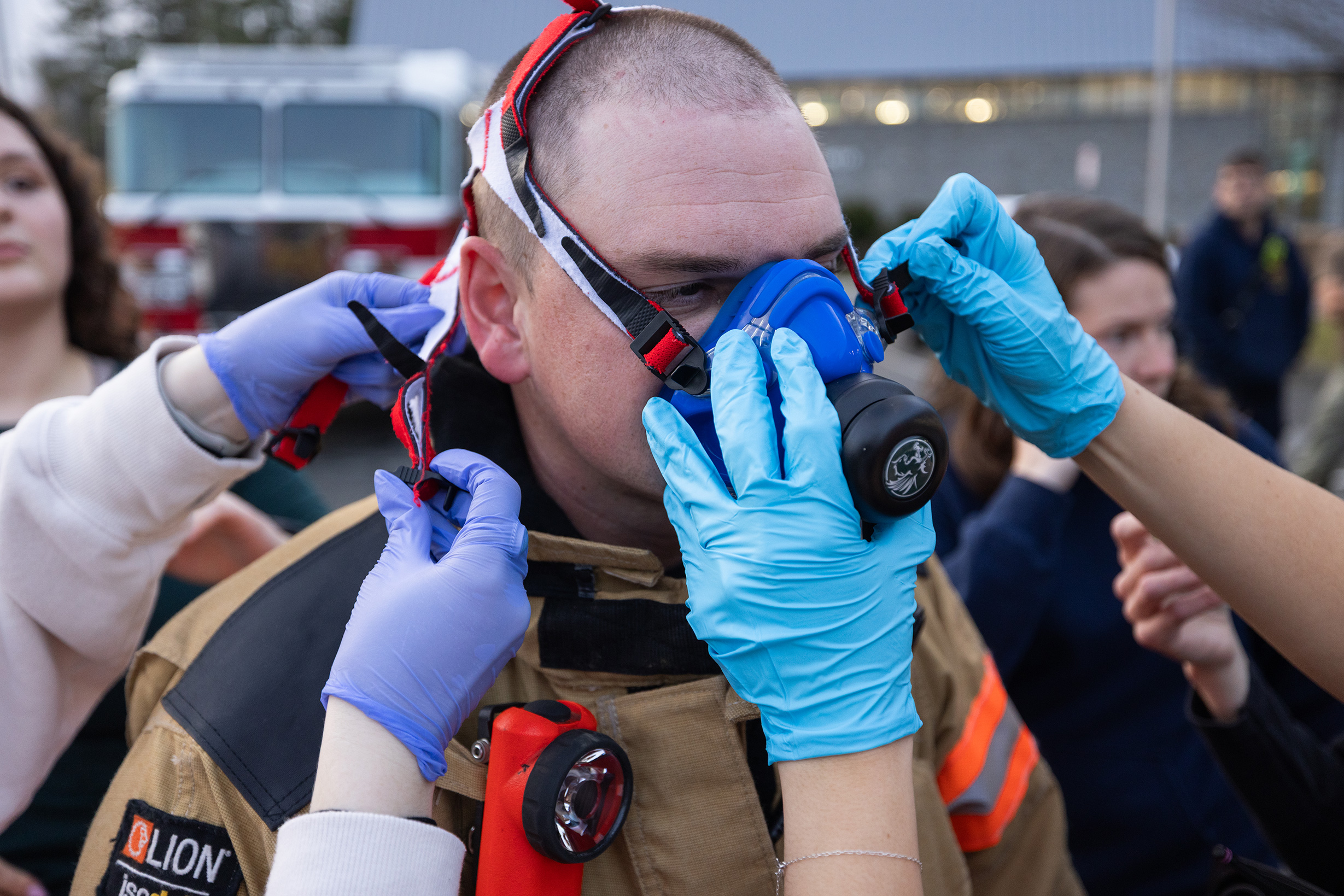 App State senior Skylar Bovine, a kinesiology major from Greensboro, right, uses a portable metabolic system to assess Boone Fire Department Engineer John Edmisten as part of grant-funded App State research spearheaded by Dr. Carolina Smith, professor of kinesiology, and conducted in collaboration with NC State. The research project calculates firefighters’ energy expenditure during specific occupational tasks to assess their energy use and workloads and compares their cardiovascular and thermoregulatory responses to different personal protective equipment, or turnout gear. Photo by Chase Reynolds