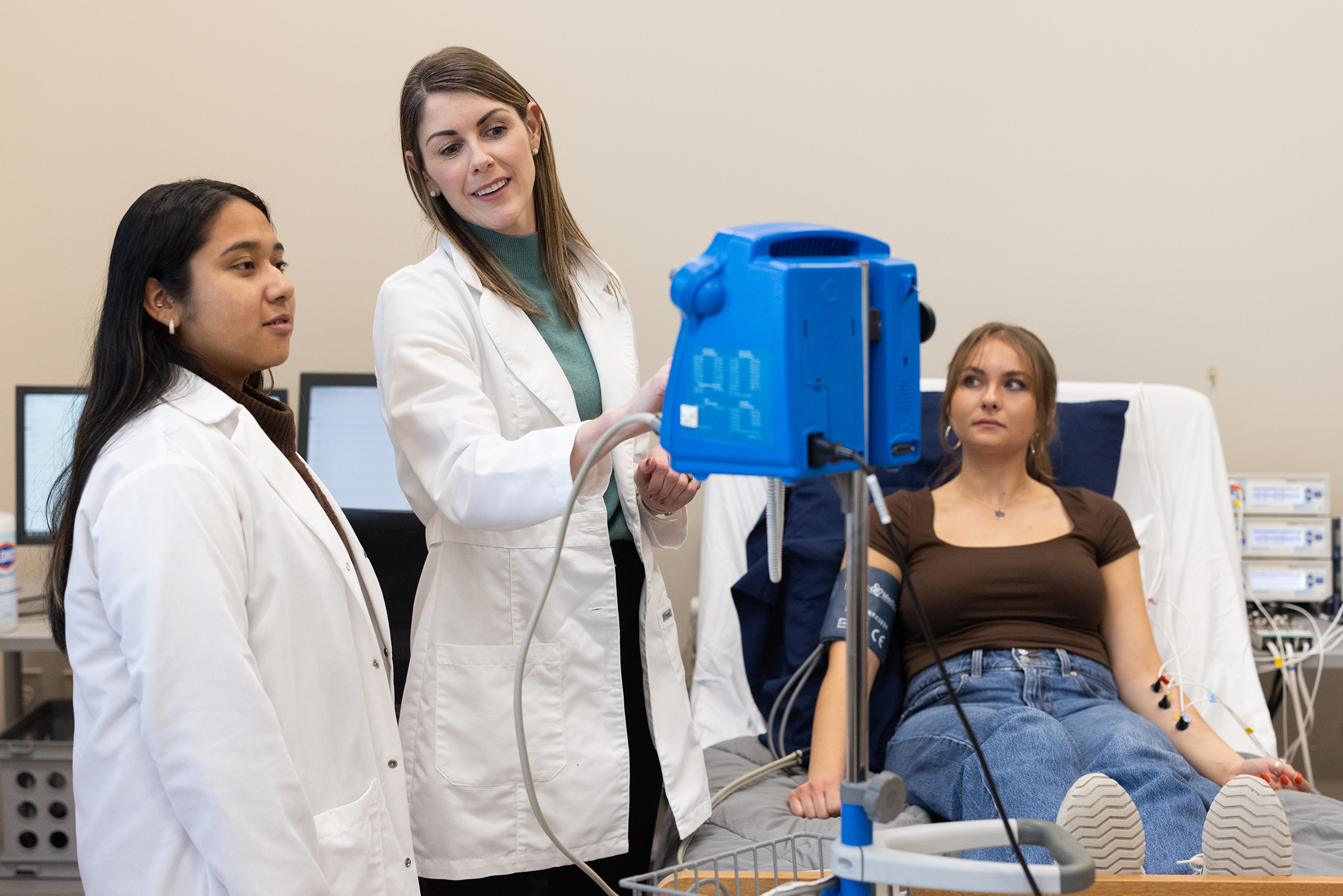Dr. Caroline Smith, App State professor of kinesiology, center, explains blood pressure and other physiological measurements to Genesis Santos, of Calypso, a senior chemistry major who is a member of App State’s Environmental Physiology Research Group, left, during testing on Samantha Mitchell, a senior nutrition and foods-dietetics major from Charlotte. Photo by Chase Reynolds