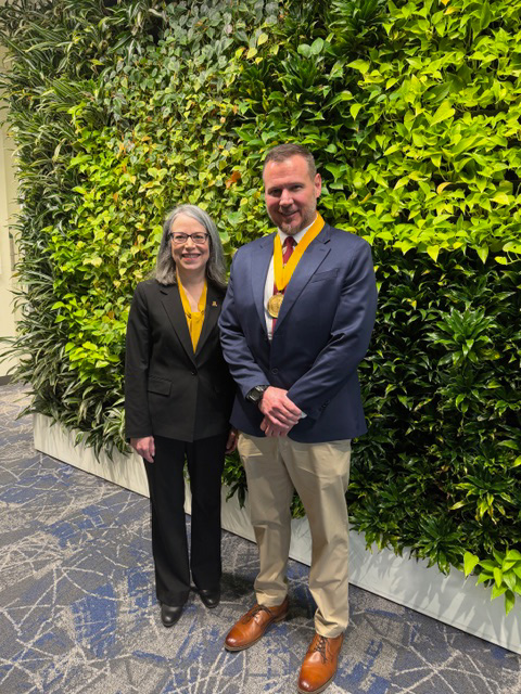 Dr. John Paul “JP” Jameson, App State professor of psychology and recipient of the 2025 Gov. James E. Holshouser Jr. Award for Excellence in Public Service, right, with App State Chancellor Heather Norris. Jameson accepted the award, which is conferred by the UNC System Board of Governors, during the board's Feb. 26 meeting in Raleigh. Photo courtesy of UNC System