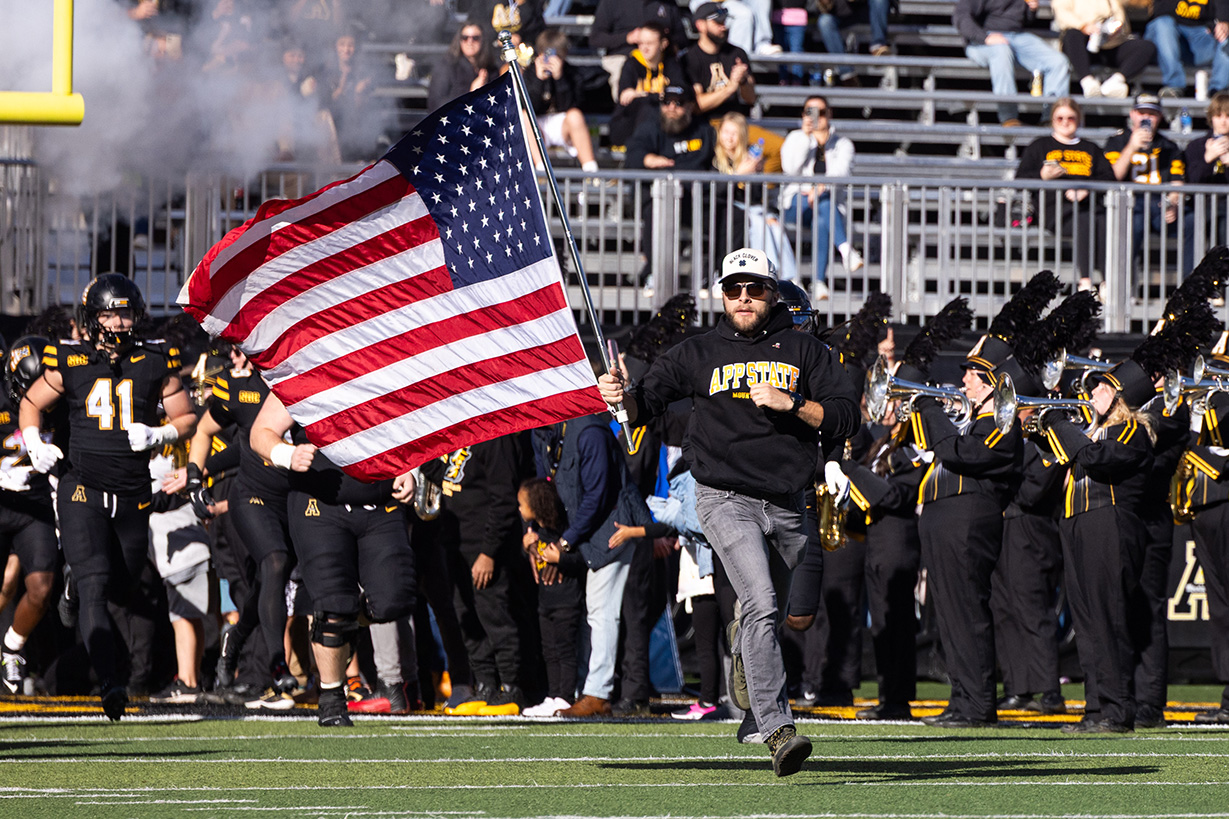 U.S. Army veteran and App State Student Veterans Association President Jacob “Jack” Sullivan, a sophomore from Charlotte majoring in finance and banking, carries the American flag as he leads the App State Mountaineers football team onto the Kidd Brewer Stadium field for the 2025 Heroes Day football game against Marshall University. Photo by Chase Reynolds