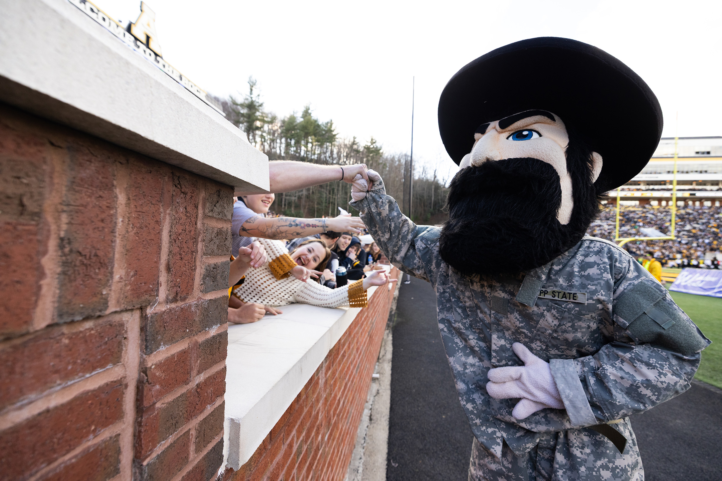 App State mascot Yosef shows his support of military-affiliated students by wearing military fatigues at the university’s 2025 Heroes Day football game. App State’s support of military families, veterans and active-duty service members earned it recognition as a top 10 Military Friendly® School for 2026–27. App State has received the Military Friendly® School designation for 17 consecutive years and the top 10 ranking for four years in a row. Photo by Chase Reynolds