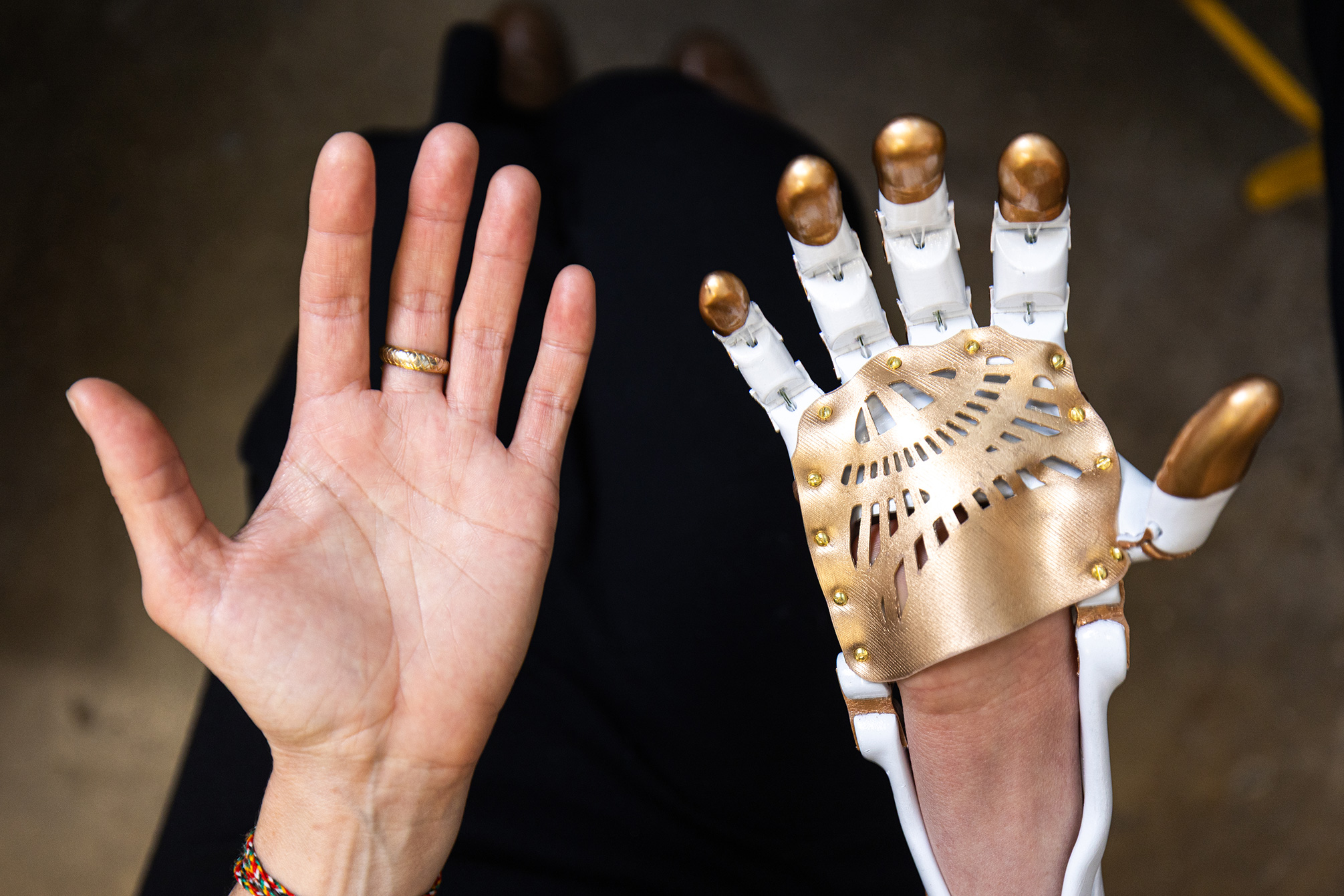 App State assistant professor Jimena Vergara-Sanz holds the latest kinetic hand model developed by her App State research team while wearing its immediate predecessor. Inspired by the Japanese art of Kintsugi, the practice of repairing broken ceramics with gold, the new model is intentionally designed to appear broken and reassembled with golden seams. It invites conversation, Vergara-Sanz said, using form and material expression to reframe disability as something visible, meaningful and powerful. Photo by Chase Reynolds