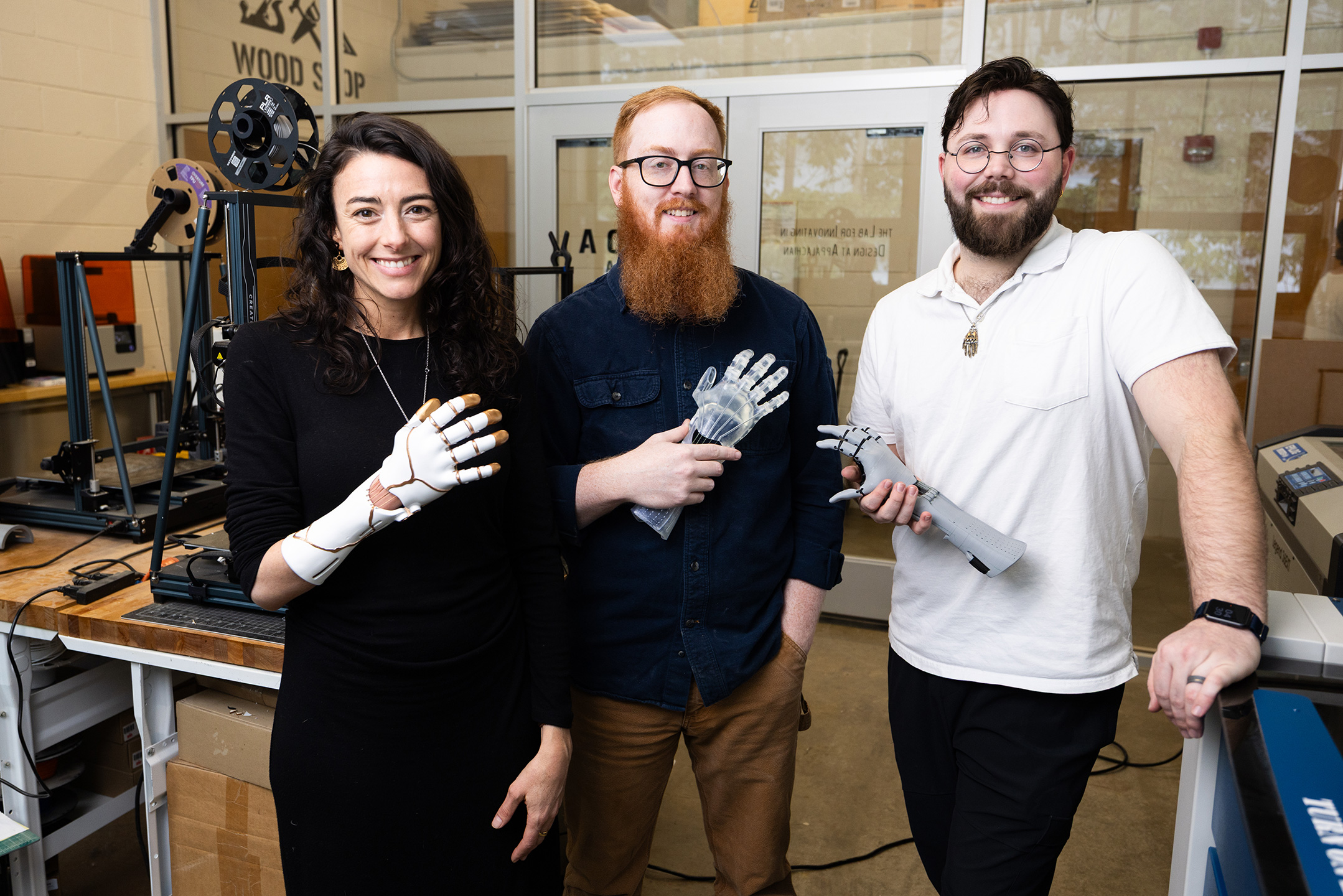 A team of industrial design students at App State is taking a human-centered approach to innovation, using 3D printing technology to design and develop next-generation prosthetic hands that are both accessible and customizable for users. Pictured, from left to right, are App State assistant professor Jimena Vergara-Sanz, who leads the project in collaboration with associate professor Dr. Garner Dewey (not pictured); Davey West, lab operations manager in App State’s Department of Applied Design; and senior industrial design major Walt Rakestraw. Vergara-Sanz, who was born without her right hand, wears one of the prosthetic hand prototypes developed by the team. Photo by Chase Reynolds