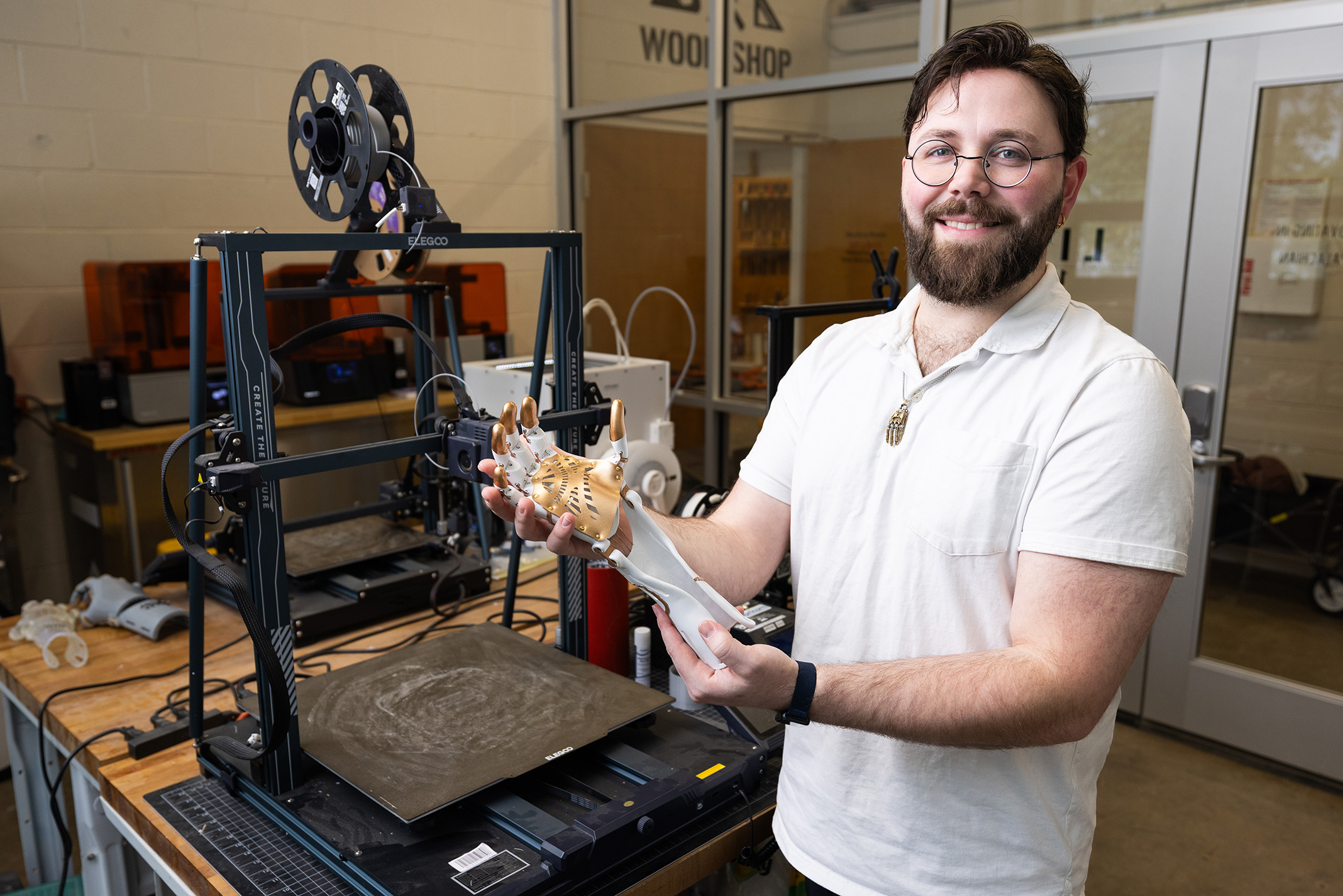 The team’s research began with an open-source model of a kinetic, or user-powered hand provided by e-NABLE, a global community of volunteers who use 3D printing to create free or low-cost prosthetic upper-limb devices. Vergara-Sanz learned of e-NABLE’s work through Frankie Flood, a professor in App State’s Department of Art who helped develop several components for the first 3D hand design created by e-NABLE.