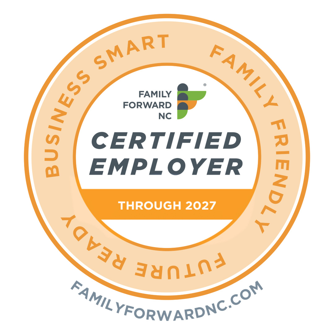 Family Forward NC Employer Certification recognizes employers that offer policies and practices that support the health and well-being of working families and children. The certification looks at employer benefits such as paid leave and wages, accommodations for pregnant and breastfeeding workers, child care supports, health and wellness benefits, and scheduling practices.