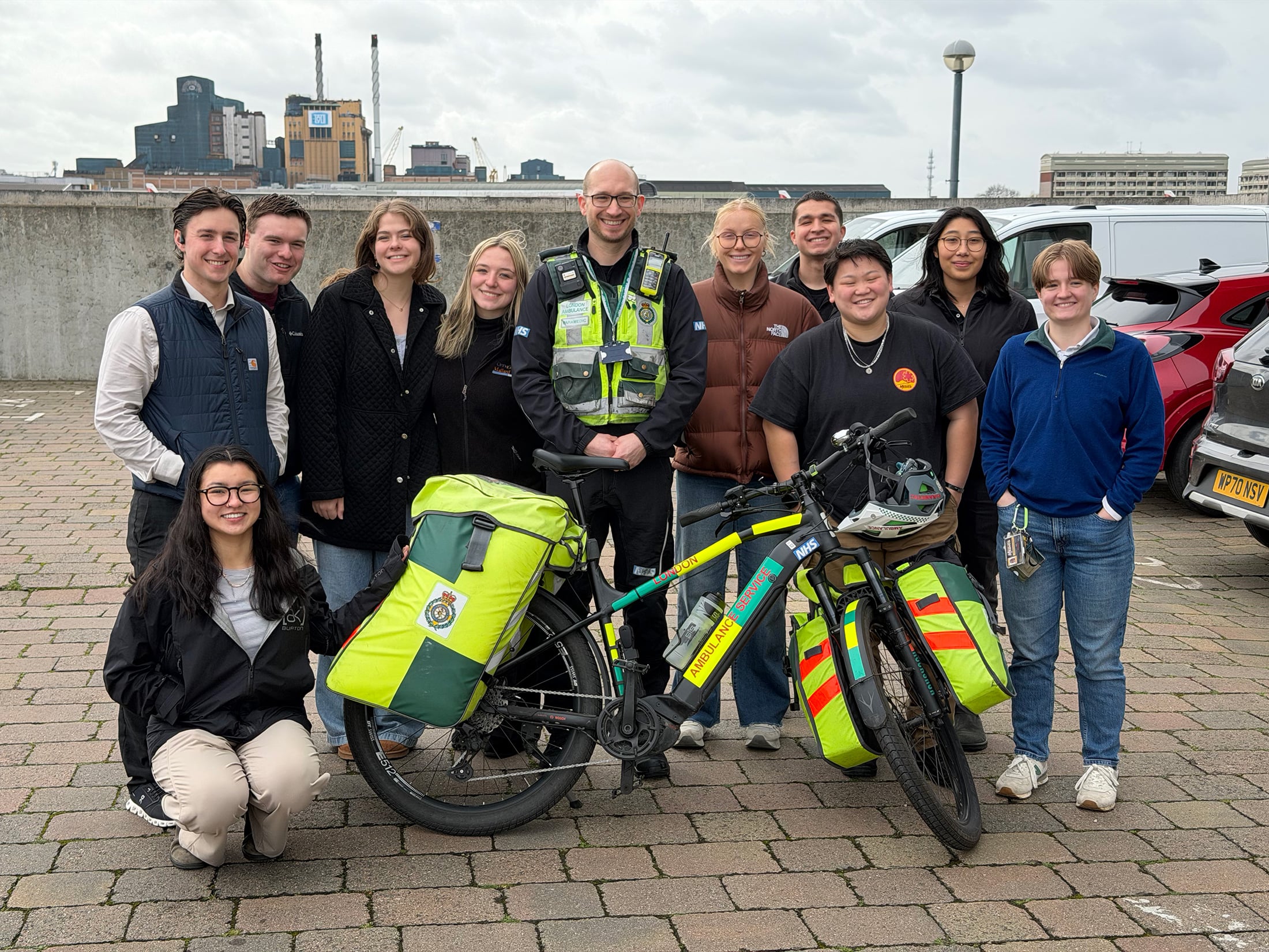 App State students and Mountaineer Medics are pictured in London, alongside Allan Woodhouse, a cycle paramedic in the London Ambulance Service Cycle Response Unit, center. Pictured with Woodhouse, from left to right, are App State students Kimberly Mai, Owen Troxell, Joshua Allen, Eden Kitchin, Morgan Pitts, Jillian Russert, Michael Navejas, Emily Bjerregaard, Raina Duggal and Danielle Denny. Photo submitted