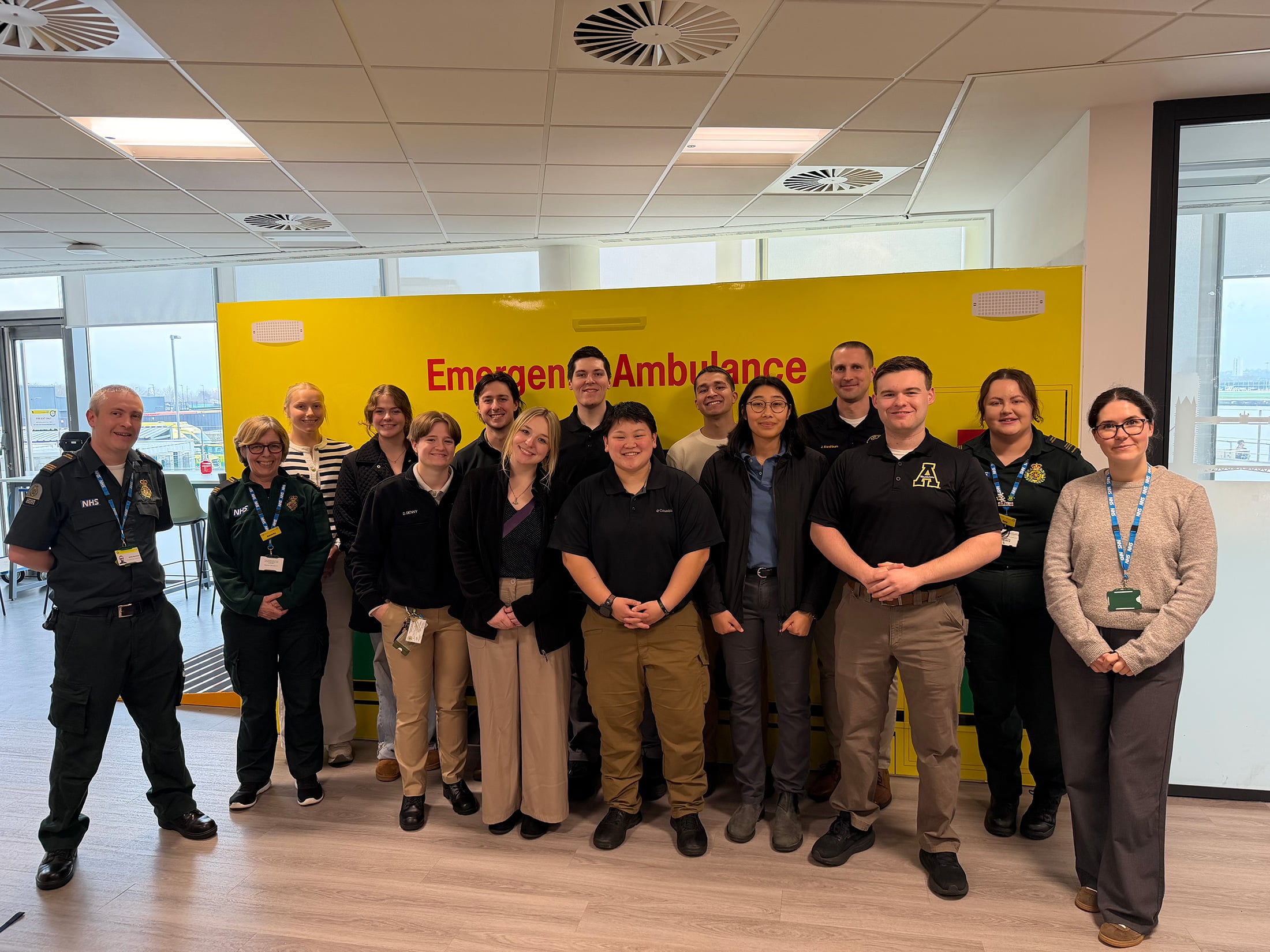 App State Mountaineer Medics students and staff members pay a visit to the London Ambulance Service (LAS) training facility in London. Pictured, from left to right, are LAS staff members James Stevenson and Amanda Cahill; App State students and staff Jillian Russert, Eden Kitchin, Danielle Denny, Owen Troxell, Morgan Pitts, App State Continuity and Resiliency Coordinator Stephen Ayscue, Emily Bjerregaard, Michael Navejas, Raina Duggal, App State Director of Environmental Health, Safety and Emergency Management Jason Marshburn and Joshua Allen; and LAS staff members Eireann Staunton and Amy Harrington. Photo submitted
